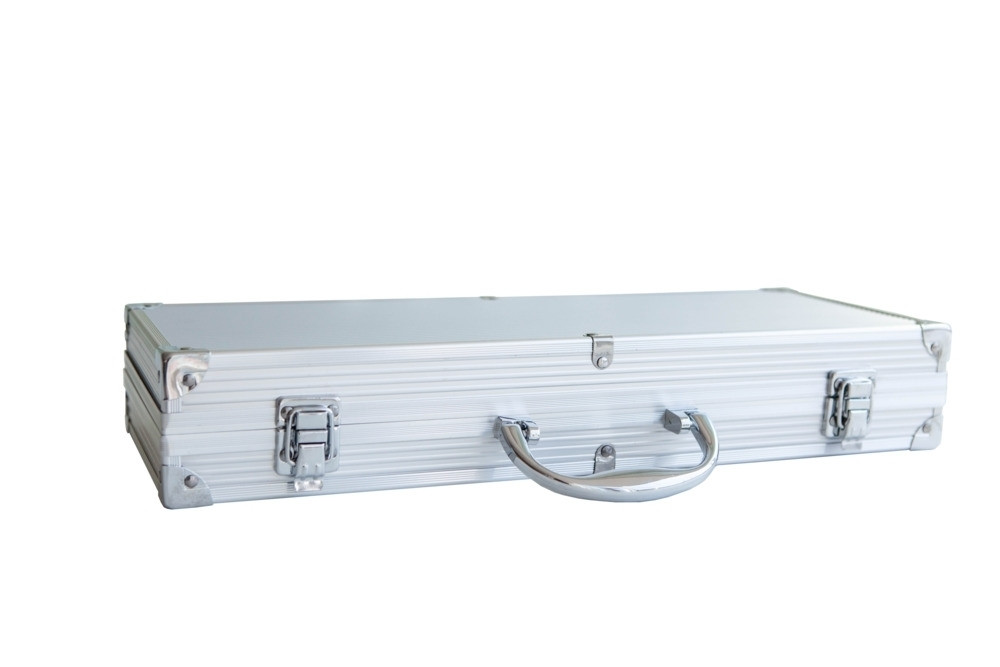 Det mångsidiga grillsetet med snygg design och lång livslängd. Grilltillbehörsdelarna levereras förpackade, fastgjorda och skyddade i en aluminiumväska. Vissa delar är försedda med en ögla för upphängning.