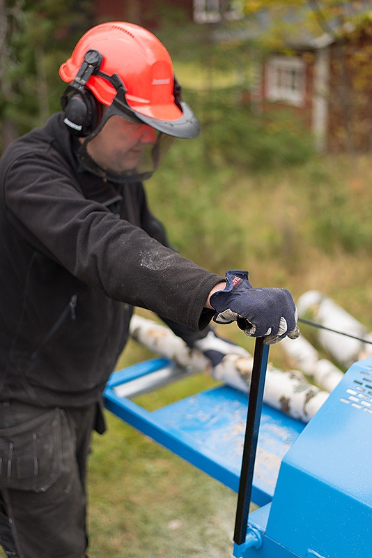 När du sågar i vagg- och balanskapar av äldre modell rör du dig mot klingan under sågmomentet. När du sågar med Rättvikskapen arbetar du från klingan, vilket ytterligare höjer säkerheten. Genom att flytta spaken till maskinens andra sida passar den även för vänsterhänta personer. För inställning av vedlängden finns ett kättingsanhåll (med fasta anhåll vill veden “hänga sig”). När du sågat färdigt och vill ställa undan Rättvikskapen, hakar du av bordet, fäller ihop det och fäster det mot såghuset. säkrast enligt Råd och Rön. På så vis tar Rättvikskapen minimalt med plats och hjulen gör att den enkelt kan köras undan. Levereras med motorskydd, elektronisk klingbroms, brytare och europakontakt.