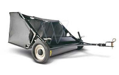 Bogserad uppsamlare med 107 cm arbetsbredd. Justerbar höjdinställning, tömning från förarposition, snabb och smidig att koppla på trädgårdstraktorn.