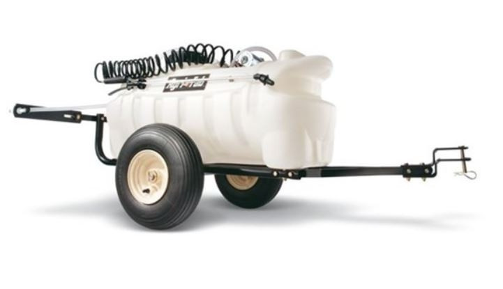 Bogserbar spruta som även kan användas som handspruta. Sprutan drivs av 12V-batteriet från trädgårdstraktorn. Arbetsbredd 2,1 meter med bom. Kapacitet 95 liter. Separat spruthandtag.