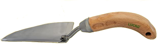 Ett verktyg i rostfritt stål och ett ergonomiskt handtag av trä.