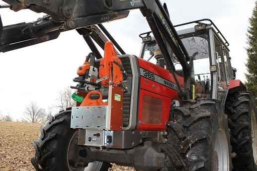 Sågarna sitter stadigt på minimal yta, samtidigt som de är lätt åtkomliga. Lådan är snabb att lyfta av med frontfäste; lossa en mutter, drag fästskruven åt sidan och ta bort lådan. Får plats i fronten av traktorn även med monterad frontlastare.